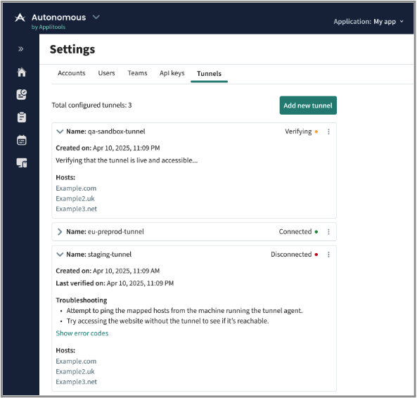 To verify that the tunnel agent is running and connected to Autonomous, confirm that the tunnel has a Connected status on the Settings > Tunnels page.