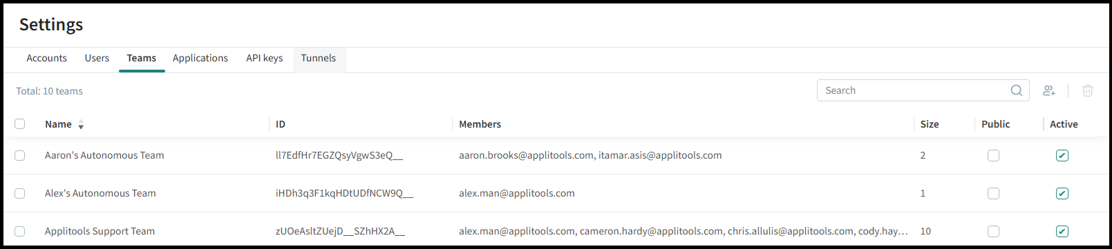 The Teams page displays all the teams currently associated with the account in a table, with a row for each team. The row for each team displays the following information: