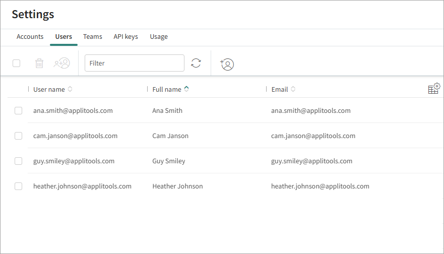 The Users page lists all users that belong to an account, their provides access to the user information view, which allows you to set a user's access rights.