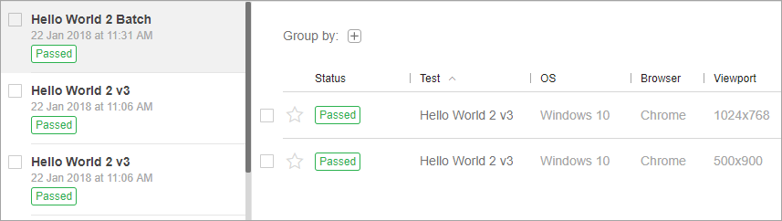 Until now, the two test runs appeared in the Test Manager as two separate entities in the batch list. The runs are actually the same test (the same sequence of events) that was run twice with a different viewport size each time, so it makes sense to batch them together. To do this, change your code as instructed below: