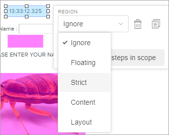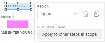 If the text to the right of the rectangle does not say "Ignore", then click on the triangle and select the ignore option. At this point, disregard the Auto Maintenance option - Apply to other steps in scope - and click outside of the drop-down menu to close it. For more information see Automated Test Maintenance.