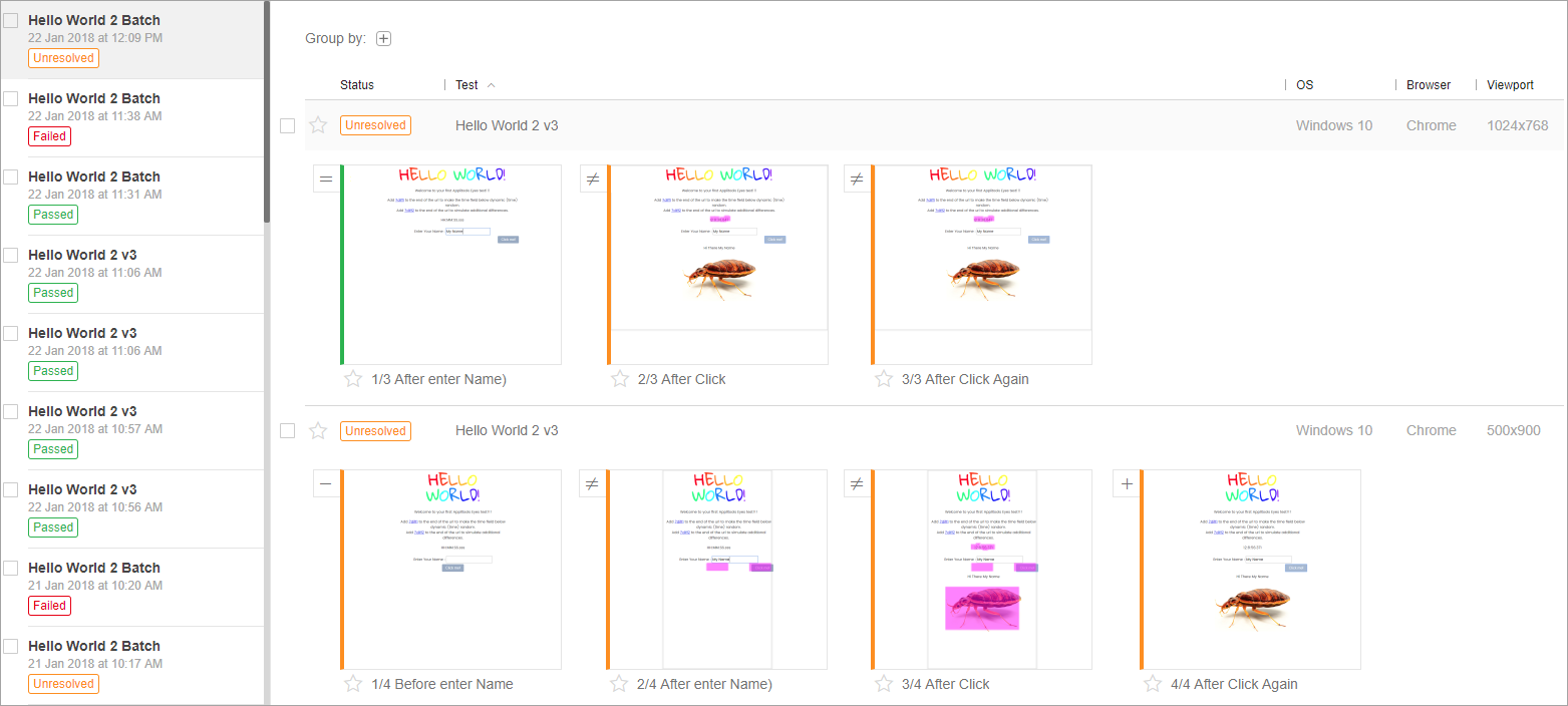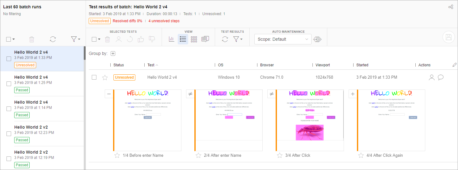 Examining the results of the first test, we can see that there are now only three steps instead of four. Eyes has not displayed a step that signaled a missing checkpoint since we accepted the missing checkpoint. The last step is no longer marked as "new" since we accepted it. However, the second and third tests are still showing differences.