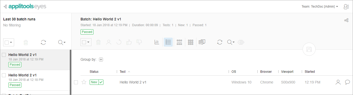 In the Eyes Test Manager, after clicking the 'update batch' button , we will see the single batch entry with a status of . Click on it, and you will see the two test results in the main panel, both with a status of
