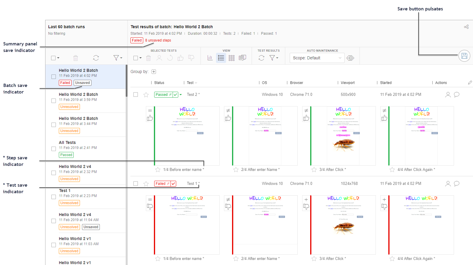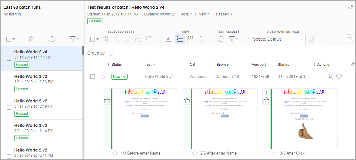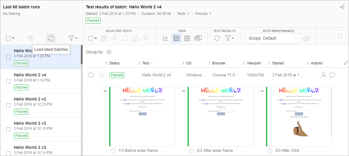 Now, if we run the test again and look at the Test Manager, we see a single entry named "Hello World 2 Batch", and there are two test results (two rows) on the main panel. If you look at the "Viewport" column, you can see the viewport that was used in each run.