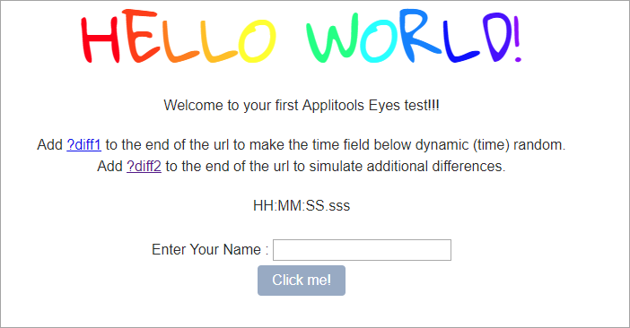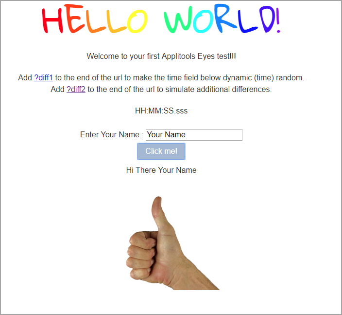 The test we're going to run executes a visual UI test on an example web page created by Applitools. If you go to https://applitools.com/helloworld2 you will see the following screen: