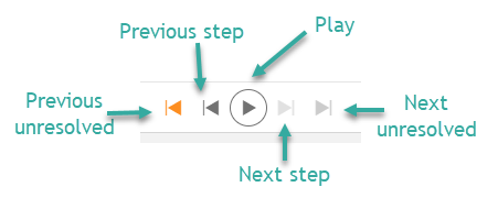 We've already described how you will automatically be taken to the next step in the test when you click accept or reject in the Test Editor. You can also move from test to test using the time line displayed at the bottom of the Test Editor screen. On the time line, each step is represented by a small rectangle whose color indicates the status of the step (unresolved , accepted or rejected). You can click on any rectangle to view that step. You can also use the time line controls to the left of the time line to jump to the previous step, the next step, the previous unresolved step or the next unresolved step.