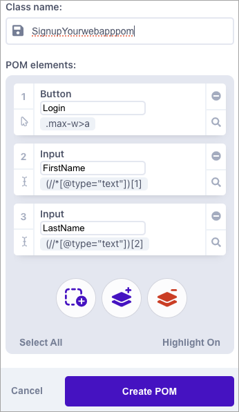 By default, the POM generator captures only interactable elements within the browser's viewport. If you need to capture elements on longer scrollable pages, scroll to the region and click Generate POM again.
